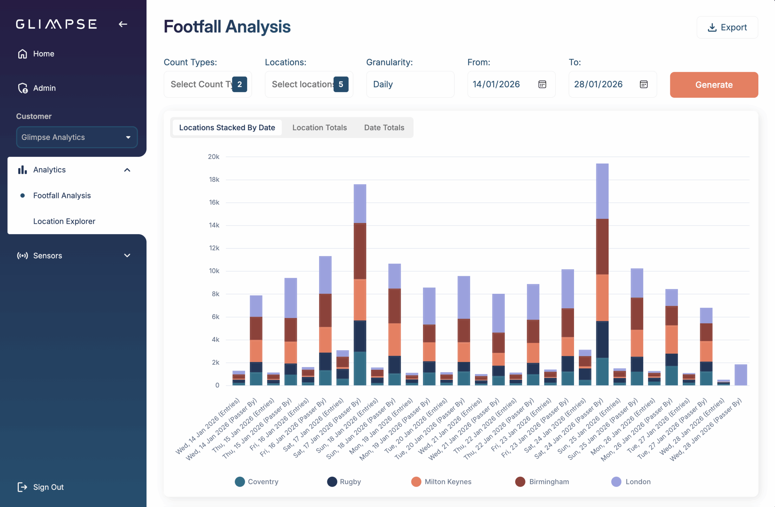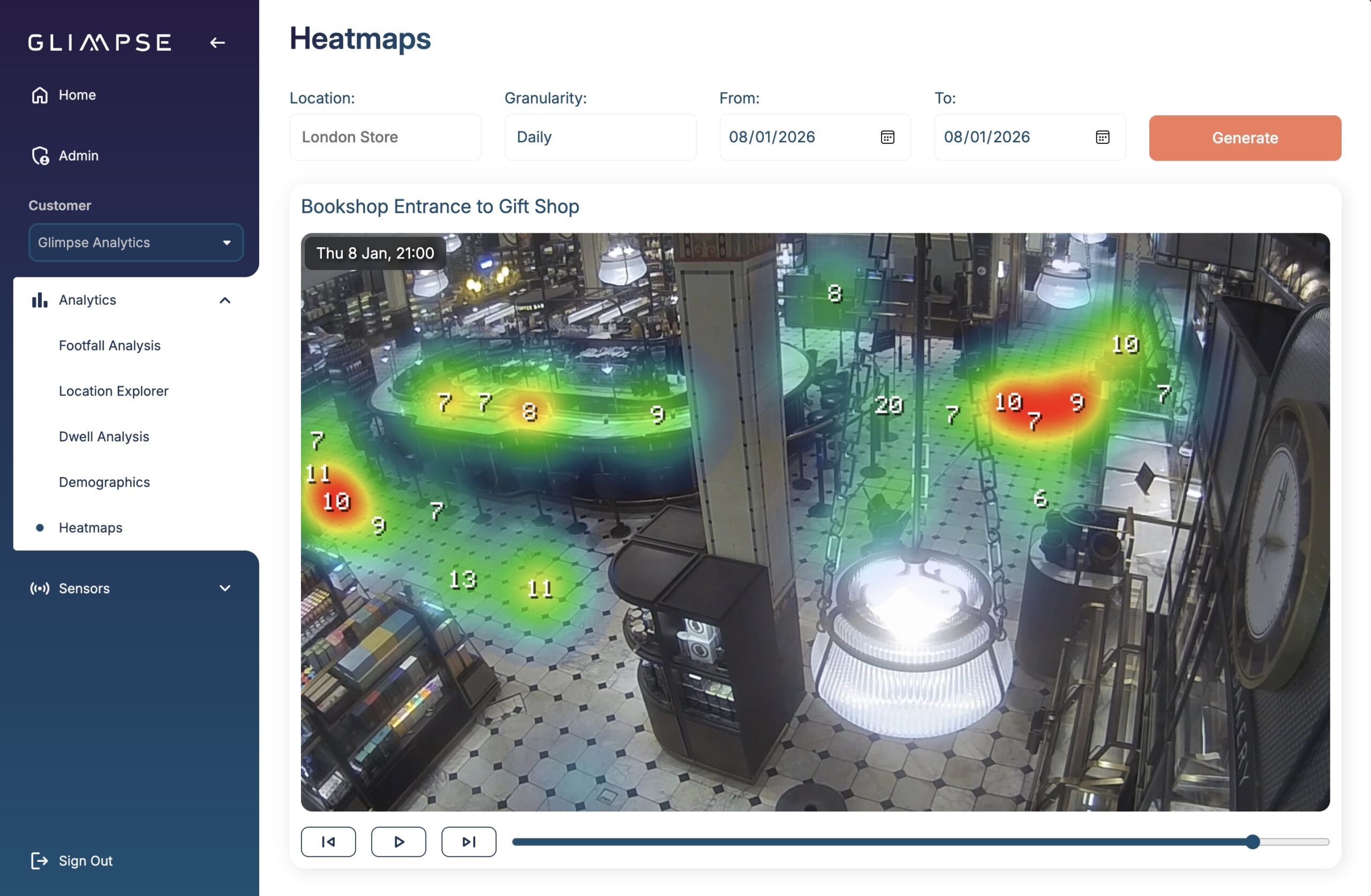 Glimpse uses computer vision to turn your in-store cameras into a high-accuracy footfall counting system. Delivers reliable footfall data, conversion insights and estate-wide analytics without installing new sensors.