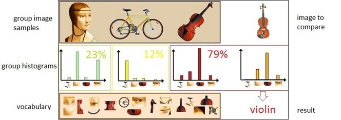 One of the main concept used in Computer Vision to classify an image is the Bag of Visual Words (BoVW). In order to construct a Bag of Visual Words, we need first of all to create a vocabulary by extracting all the features from a set of images (eg. using grid-based features or local features). Successively, we can then count the number of times an extracted feature appears in an image and build a frequency histogram from the results. Using the frequency histogram as a basic template, we can finally classify if an image belongs to the same class or not by comparing their histograms (Figure 3).