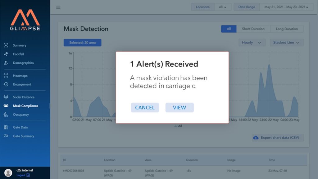 Understand when and where passengers fail to wear face coverings with real-time mask detection